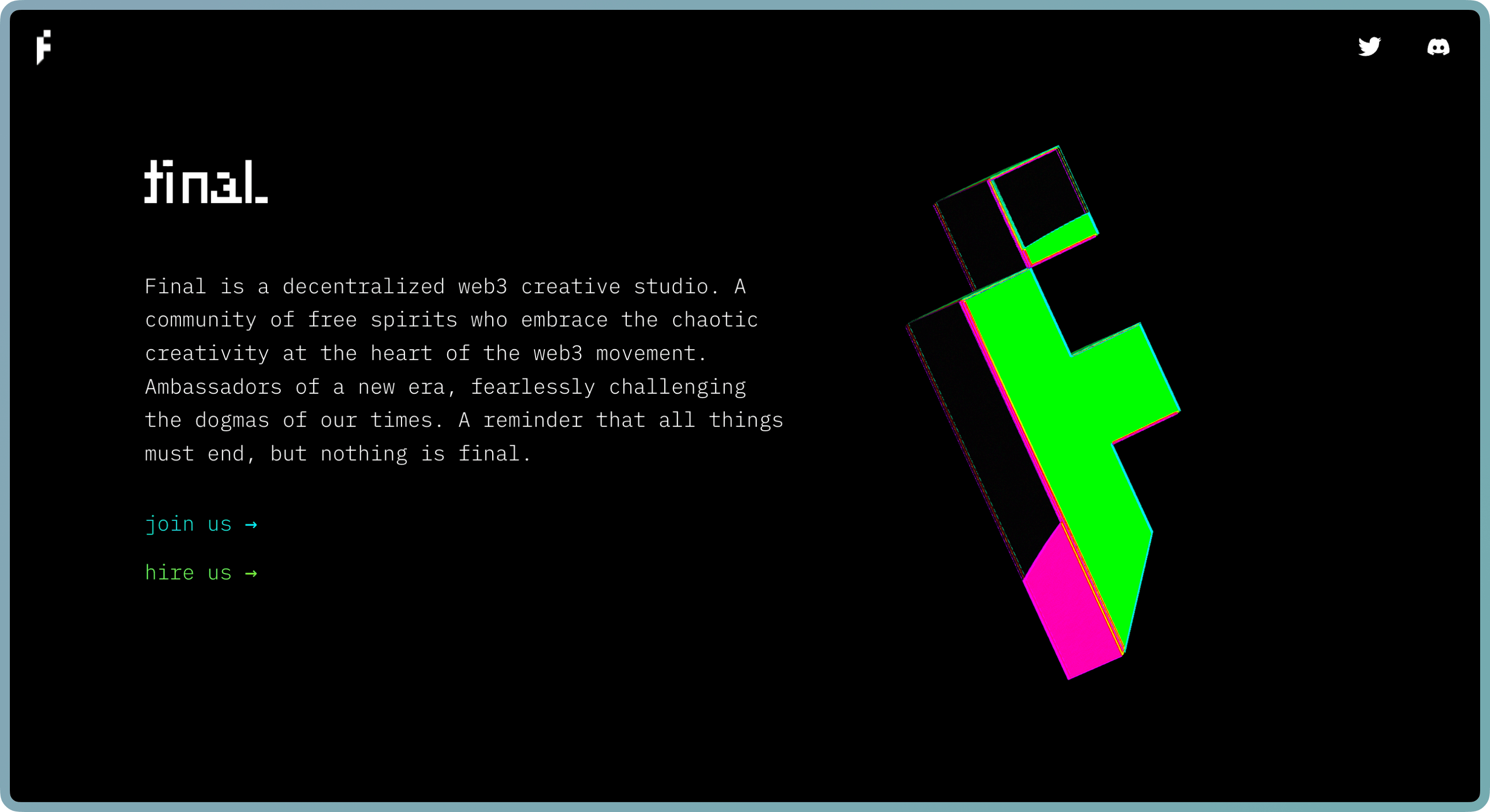 I'm one of the designer co-founders of FinalDAO, a Web3 design studio where we focus on our own set of fresh ideas and cool products.